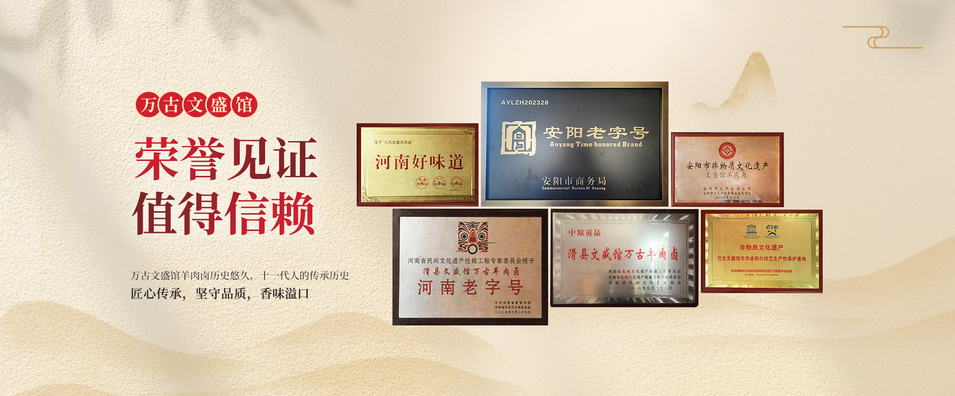 萬古文盛館羊肉鹵從始至今,始終堅持“每代傳一門,傳男不傳女,傳內不傳外”的祖規。在傳承過程中,很多有關典籍已失于戰亂和水患。主要收集的傳承譜系和有關記載如下: 第 一代:王家孝(1654-1733)萬古文盛館羊肉鹵創始人; 第 二代:王憲文(1678-1758); 第 三代:王全仁(1710-1788); 第 四代:王元相(1748-1830); 第 五代:王克敬(1778-1869); 第 六代:王心欽(1807-1887); 第 七代:王光玉(1839-1921); 第 八代:王發喜(1869-1919); 第 九代:王文聚(1905-1981);王文聚在當地人緣極好。他在梁村集長期經營飯館,經濟條件比一般人較好,常常資助貧弱者。中華人民共和國成立之初,為了響應國家的號召,并把正在經營的文盛館全部資產,融入萬古合作社,將原梁村文盛館店址搬遷到萬古集經營。成為了供銷社的正式職工,擔任羊肉鹵制作技師,一直工作到退休,他制作羊肉鹵的技術非常高超,味道鮮美獨特,把畢生精力全部用在羊肉鹵的研發、創新、傳承上,因萬古玉皇閣(全國四大名閣之一)廟會影響周邊數百公里,每天食客絡繹不絕,皆以吃上王文聚親手制作的羊肉面為榮,影響巨大。 第十代:王守真(1944-2009);改革開放初期,受聘于滑縣飲食服務公司,先后在順河街回民食堂、國營旅社回民飯店工作,專門從事羊肉鹵的制作經營和技術傳授。王守真善于鉆研,并不斷創新,使萬古文盛館羊肉鹵的品質得到又一次飛躍。 王洪標、第十一代傳人,王洪標2010年被河南省人民政府授予省級萬古文盛館羊肉鹵制作技藝傳承人。王洪標在繼承前十幾代藝人傳統技藝的基礎上,大膽探索、潛心鉆研、不斷創新,是羊肉鹵的味道更加鮮美,醇香四溢,正如坊間盛傳“食一口而動全身,讓人回味無窮之妙”,以及“東西南北都吃遍,不如文盛館羊肉面,喝一碗文盛館羊肉湯,一年四季想得慌”,可見其味道堪稱珍饈美饌。王洪標開展手工技藝和傳統文化的廣泛傳播,大力培養技術人才。建設規模性養殖園,對每只羊從喂養到餐桌整個鏈條,實行身份證識別制度,建立綠色環保經營模式,面向全國開展連鎖加盟經營,讓更多人吃上放心肉和傳統的美味佳肴而努力。 2007年;河南省文聯、河南省委宣傳部授予“河南老字號”稱號; 2009年6月,被河南省人民政府、河南省文化廳列入“河南省非物質文化遺產”保護名錄; 2010年,被安陽市人民政府列入“安陽市非物質文化遺產”保護名錄; 2016年6月,被河南大河報、河南餐飲與飯店行業協會評為“河南好味道”; 2016年9月被河南省民間文化遺產搶救工程工作委員會、河南省民間文化遺產搶救工程專家委員會、河南省民間文藝家協會授予“中原貢品”稱號; 2017年被錄入聯合國教科文組織非物質文化遺產大數據平臺,文盛館羊肉鹵制作技藝生產性保護基地 2020年授予:中華老字號 2021年4月授予:安陽美味 2023年授予商務局:“安陽老字號”中 央電視臺CCTV7“鄉土”、中 央電視臺CCTV7“鄉愁”河南省電視臺“老家的味道”、CCTV17套“”誰知盤中餐”CCTV央視2套、河南省電視臺“香香美食”、河南省電視臺“老家的味道”滑縣電視臺、“傳奇滑州”等各大媒體采訪宣傳報道。 “文盛館”羊肉鹵,展示了中原飲食,文化的博大精深,展示了民間傳統手工技藝的獨特。為積極宣傳中原傳統飲食文化起到了無可代替的推動作用。